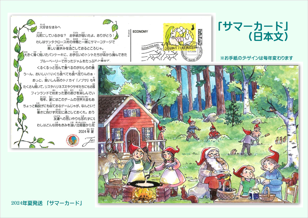 クリスマスに届く「サンタさんからの手紙」には、サンタさんへお返事を書くことができる専用の「返信ハガキ」が同封されています。このハガキを使ってお返事を出してくれた方全員に、翌年8月にフィンランドのサンタさんから"ありがとう"のお返事「サマーカード」が国際郵便で届きます!