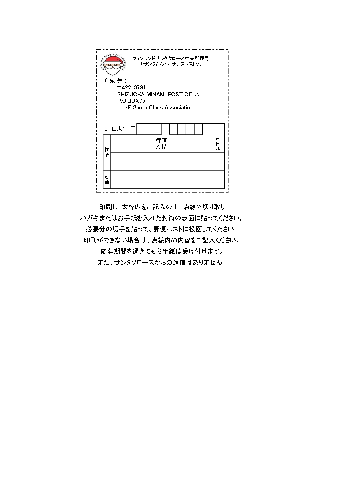 ・この応募によるサンタさんからのお返事はありません。 【サンタさんからの手紙】をご希望の方は、HPお申込みページ もしくは、郵便局窓口にある専用振替用紙つきチラシより別途お申込みください。