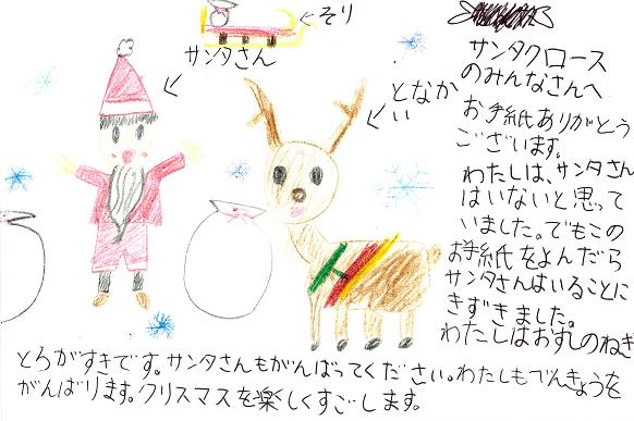 TOPページ » 「サンタさんへの手紙」作品発表 » 2012年度作品 » 東北 東北 0歳~6歳 植松 菜央(3才) 門馬 梨乃(3才) 鈴木 尊人(4才) 森田 ひより(4才) 道川 うい(4才) 東海林 芹菜(4才) 折笠 望菜(5才) 門馬 祢々(5才) 小松 鼓動(5才) 佐々木 優衣(5才) 大森 唯香・香史郎(5才) 加藤 璃空(5才) 馬場 明音(5才) 鈴木 柑奈(5才) 安田 花音(6才) 直井 桃子(6才) 橋本 花帆(6才) 佐藤 良助(6才) 7歳~8歳 大澤 雛(7才) 嶺岸 ほのか(7才) 石河 凛々(7才) 松木 志帆(8才) 渡辺 ゆめき ・はやき(8才) 佐藤 隆太(8才) 伊藤 ふみ(8才) 川村 恋瑚(8才) 西山 彩子(8才) 生田目 光(8才) 9歳~10歳 佐々木 英美莉(9才) 三浦 誇雪(9才) 川﨑 端奈(9才) 佐藤 星那(10才) 中山 栞(10才) 小林 千乃(10才) 瀬戸 彩虹(10才) 11歳~一般の部 菅野 雅文・百花(11才) 中川原 勇耶(11才) 矢萩 悠佳(11才) 松本 航輝(12才) 齋藤 あかね(12才) 丹 衣代利(12才) 岡本 野乃花(16才) 那須 さおり (一般) 小原 勉(一般) 小林 真知子(一般) 村上 美和子(一般) 宮原 洋子(一般) 柴山 みつ江(一般)
