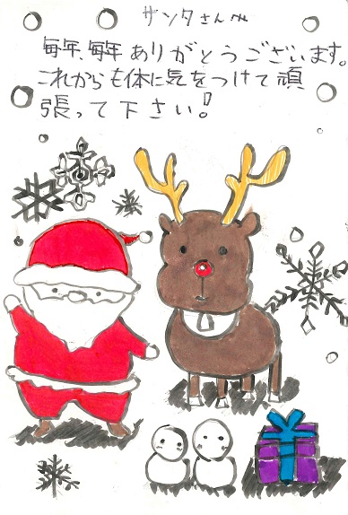 TOPページ » 「サンタさんへの手紙」作品発表 » 2015年度作品 » 中国 中国 0歳~6歳 丸橋 了輔(3才) 渡邊 諒(3才) 八木沼 駈(3才) 大藤 巽(3才) 上田 翔聖(4才) 上田 崇高(4才) 儀間 歩(5才) 前 希花(5才) 笠 敦仁(5才) 甲田 桃菜(5才) 齋藤 崇葵(5才) 武内 心優(6才) 渡邊 あんず(6才) 末本 佑衣(6才) 井上 佳音・勝晴(6,5才) 錦織 まりな(6才) 丸橋 一輝(6才) 福冨 唯菜(6才) 片岡 明音(6才) 鈴木 結賀(6才) 7歳~8歳 道免 和沙・美紗都(7,2才) 佐藤 逸巧(7才) 鶴田 佳萌子(7才) 村上 真(7才) 村上 美桜(7才) 藤井 瑠美愛(7才) 佐々木 月(7才) 末宗 はる・とうこ・いぶき(8,6,2才) 岡野 日菜子(8才) 草薙 こなつ・このみ(8,3才) 寄髙 栞(8才) 林 姫菜(8才) なんり たかひろ(8才) 9歳~10歳 錦織 なぎさ(9才) 藤井 美優(9才) 武部 礼夢(9才) 山本 美乃梨(9才) 近藤 太郎(9才) 元部 直(9才) 大司 友美(9才) 石原 千代・亘(10,7才) 新宅 陽樹(10才) 渡邊 かりん(10才) 勝部 あみ(10才) 白野 愛弥(10才) 河畑 幸夏(10才) 清水 芙実(10才) 11歳~一般の部 唐木田 そらり(11才) 妹尾 乃愛(11才) 高橋 柚歌(11才) 岡本 由菜(12才) 中原 麻結(12才) 加藤 里珠(13才) 春名 雪乃(14才) 加藤 美結(15才) 渡邊 くるみ(15才) 清水 千智(15才) 三宅 里奈(18才) 篠原 今日子(一般) M.K(一般)