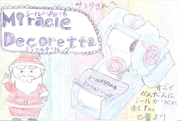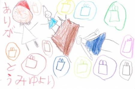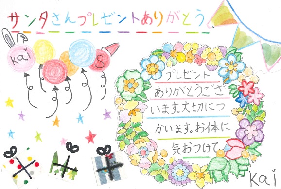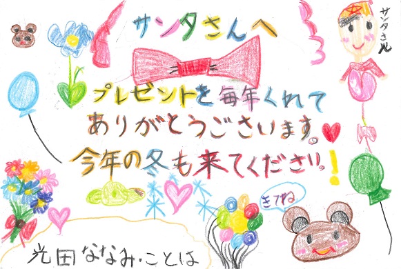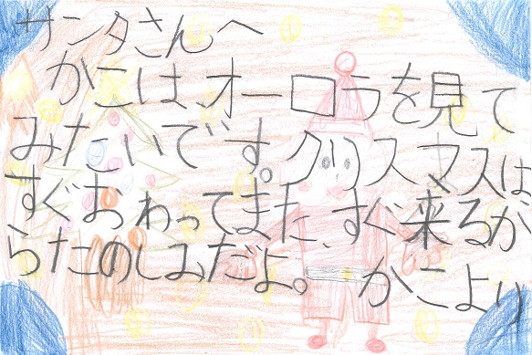 TOPページ » 「サンタさんへの手紙」作品発表 » 2018年度作品 » 中国 中国 0歳~6歳 古志野 穂香(0才) 豊園 京雅(0才) 海田 紬葵(1才) 内藤 和来(2才) 木下 琴葉(2才) 上田 佳穂(3才) 守屋 椎華(3才) 舟倉 諒(4才) 高橋 笑瑠(4才) 関澤 月雲(4才) 松崎 朱里(4才) 福永 蒼馬(5才) 岡田 実優(5才) 末宗 いぶき(5才) 道脇 直大(5才) 金丸 心咲(5才) 平光 千恵(5才) 木下 葉音(5才) 池田 春佳(5才) 末富 匠(5才) 礒本 瑛晨(6才) 河村 香澄(6才) 7歳~8歳 上田 崇高(7才) 谷森 潤奈(7才) 光田 菜七実・琴葉(7,5才) 山下 紗世(7才) 大森 天寧(8才) 東原 花呼(8才) 儀間 歩(8才) 木村 水蓮(8才) 友塚 咲翔(8才) 9歳~10歳 田辺 心実・真由葉(9,12才) 鈴木 陽菜(9才) 武内 心優(9才) 田中 智彩(9才) 井上 怜南(9才) 太田 穂波(9才) 藤井 瑠美愛(9才) 井上 佳音・勝晴(8,9才) 岡田 芽依(9才) 岡﨑 梨乃(9才) 片岡 明音(9才) 久山 花音(9才) 友實 乙葉(10才) 小川 葵大(10才) 鶴田 佳萌子(10才) 西田 花衣(10才) 山本 悠真(10才) 和木 隆太朗(10才) 河野 鈴愛(10才) 川田 真央(10才) 11歳~一般の部 草薙 こなつ・このみ(11,7才) 播井 円郁(11才) 幹戸 菜々子・葵(11,9才) 宮島 柊陽(12才) 藤井 美優(12才) 金村 優有(12才) 柏﨑 美緒(一般) 高根 瑠美子(一般) M.K(一般)